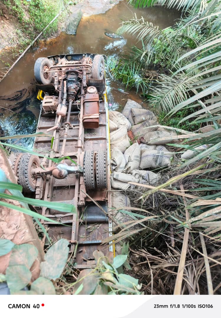 A Kia Rhino truck transporting bags of dried cocoa beans has plunged into the Ben-ne-ben River near Assin Mankata in the Assin North District, leaving several occupants injured.